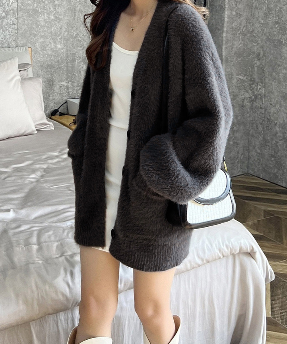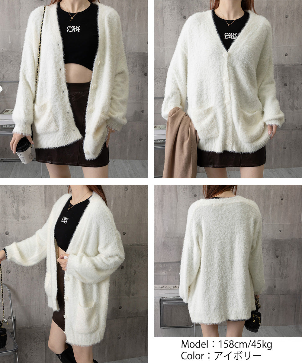ふわふわとしたモヘアタッチ素材が魅力のオーバーサイズカーディガン。